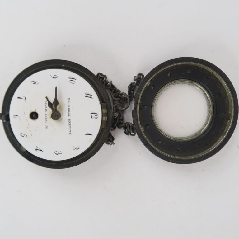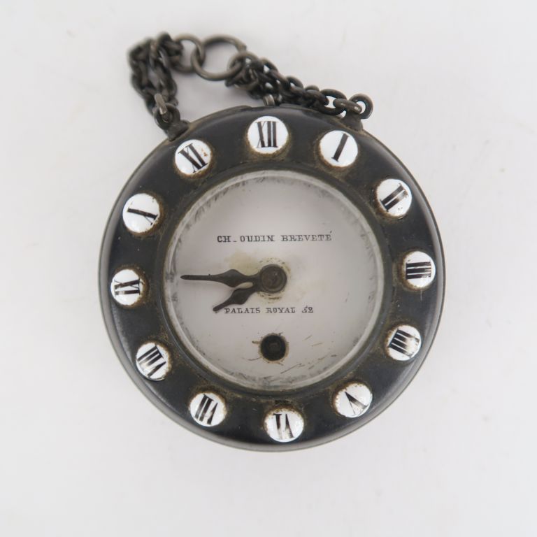 Charles OUDIN. Montre de gousset en métal patiné noir. Cadran émaillé logé dans un coque ornée de cabochons émaillés à chiffres romains. Signée "Ch. Oudin breveté Palais royal". Diam. 5 cm.