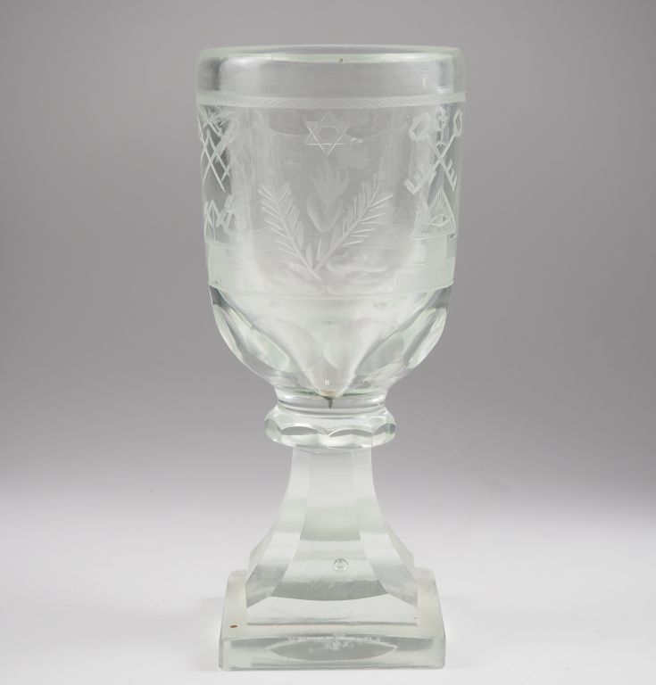 Coupe maçonnique en cristal taillé à décor gravé de temples et de symboles maçonniques. Dédicacé et daté 1901. H. 21 cm.