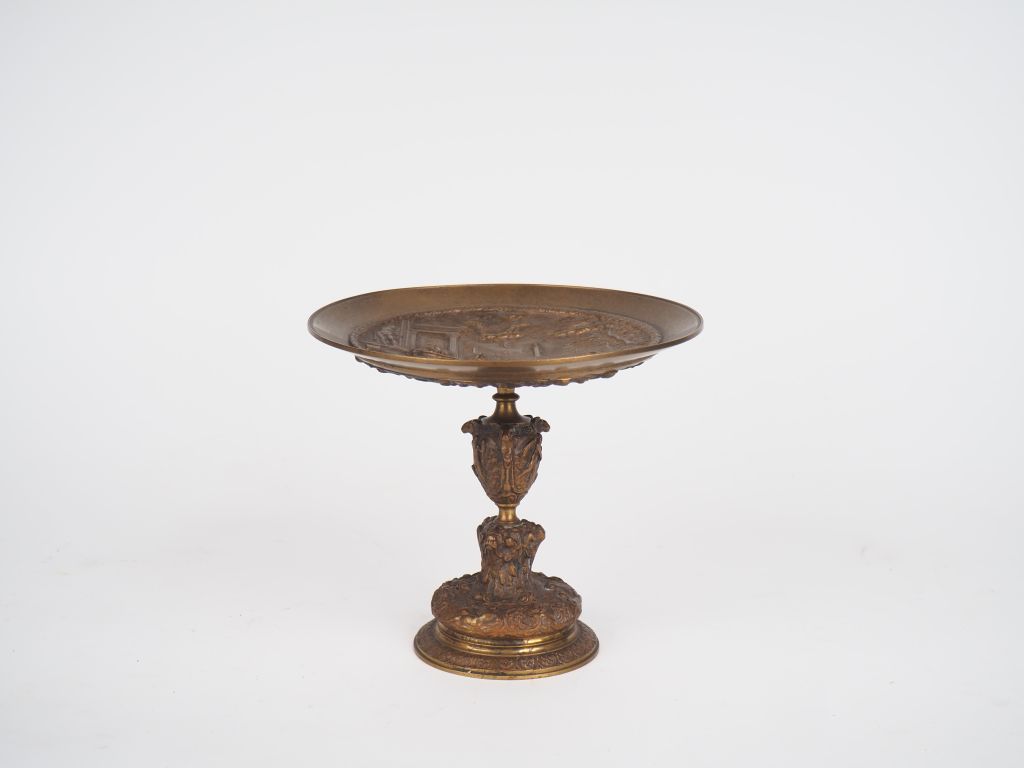 Coupe sur pied Napoléon III de style Renaissance en bronze et laiton, à décor de grotesque et de scène à l'antique en médaillon. H. 15,5 cm. Fonte Susse Frères (signée).