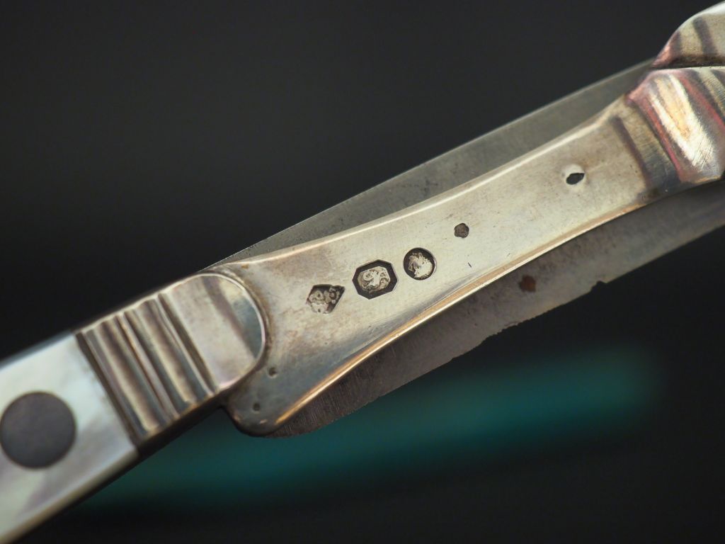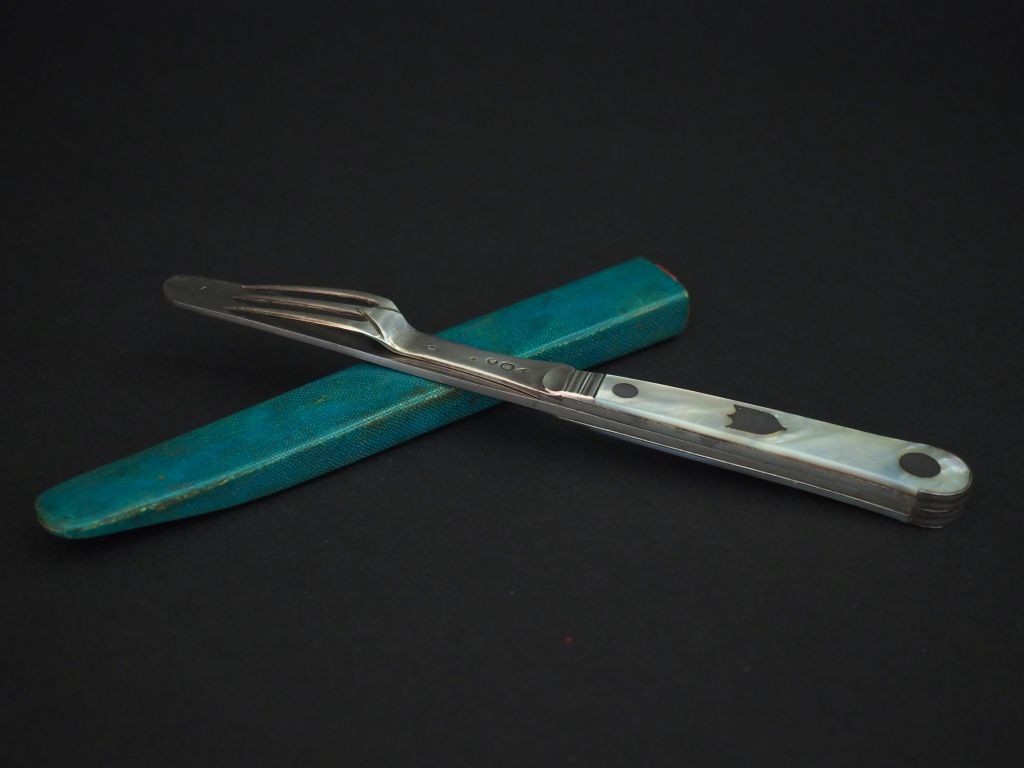 Couvert de voyage ou de chasse XIXème en argent, métal et nacre à décor d'un blason, dans son étui en galuchat vert. Poinçon au coq. M.O : BA. L. 21 cm. (petits accidents au galuchat).