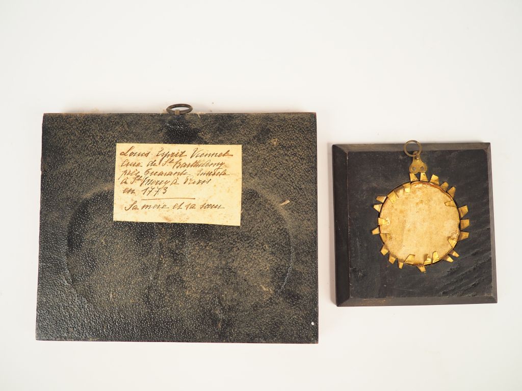 Dans un même encadrement en citronnier, trois miniatures « portraits » fin XVIIIème. Dim.15,5 x 18,5cm On y joint une miniature début XIXème « portrait de jeune fille ».