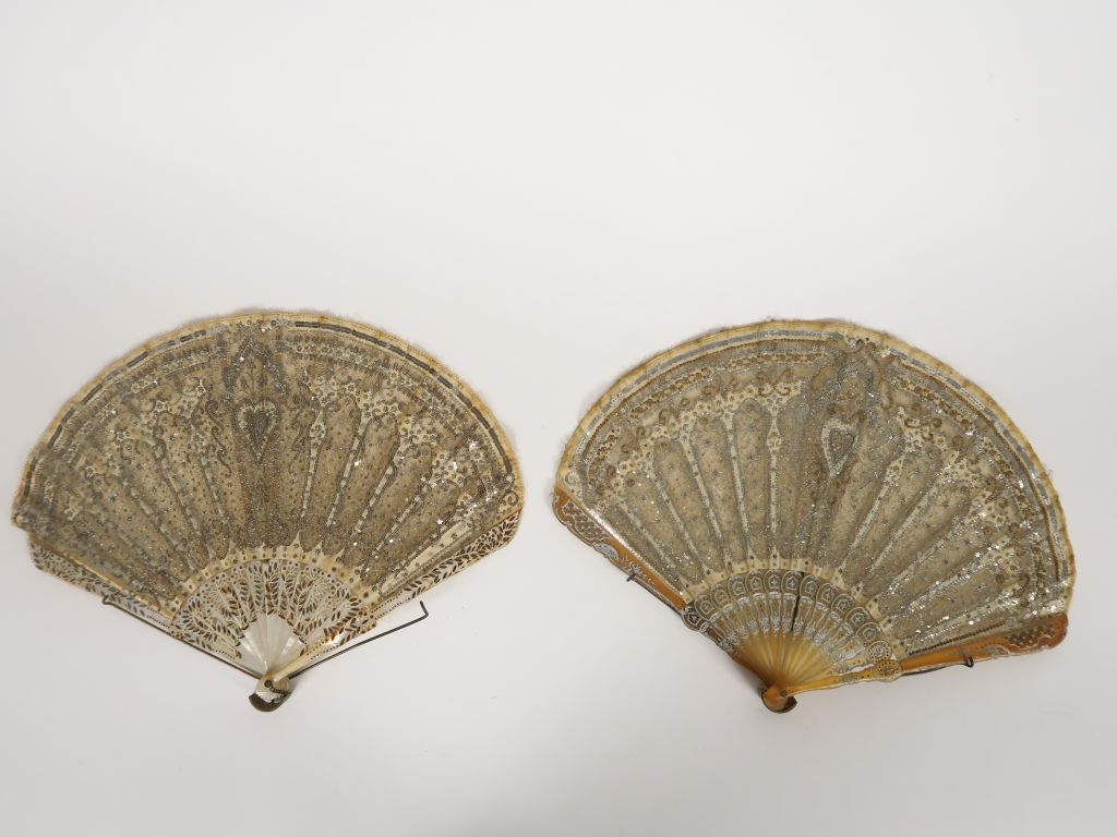 Deux différents éventails en nacre ou corne à décor de rinceaux. H. 27...