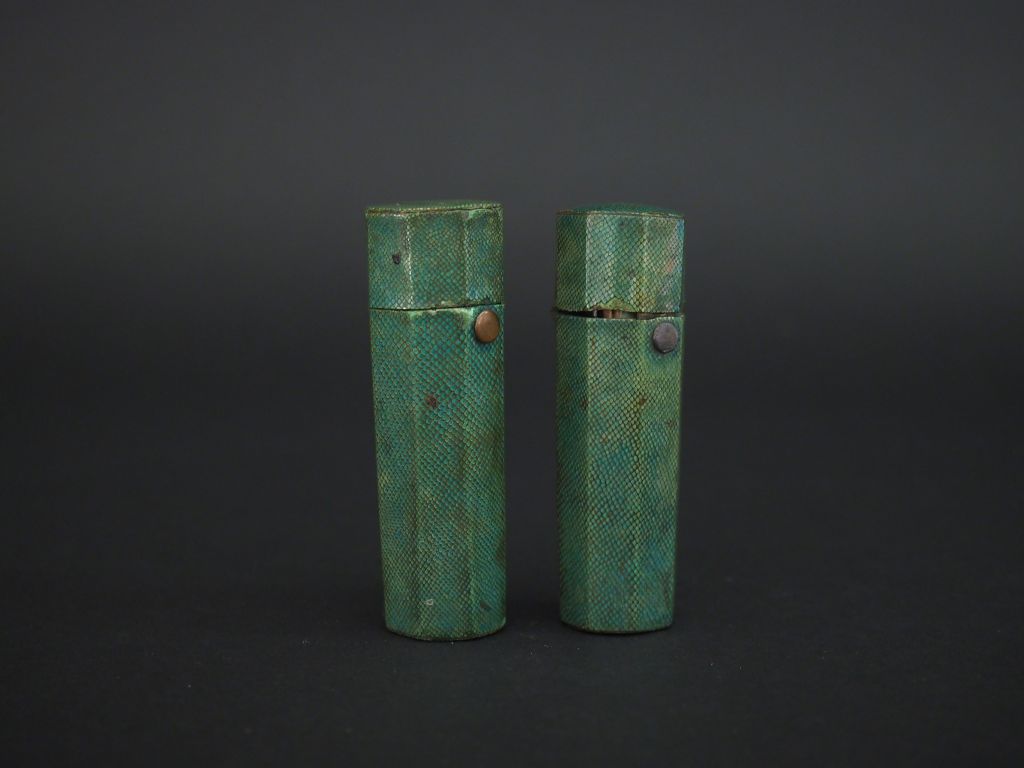 Deux nécessaires à ongles début XIXème en galuchat vert. Dim. 7,5 x 2 cm. (Usures).