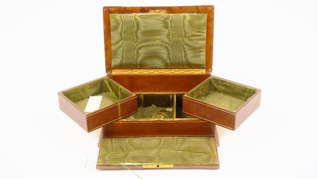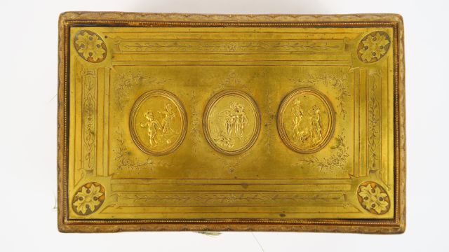 Ecrin à bijoux de style Louis XVI en cuir, couvercle en métal gravé à décor de médaillons figurant des enfants, signés Legastelois
