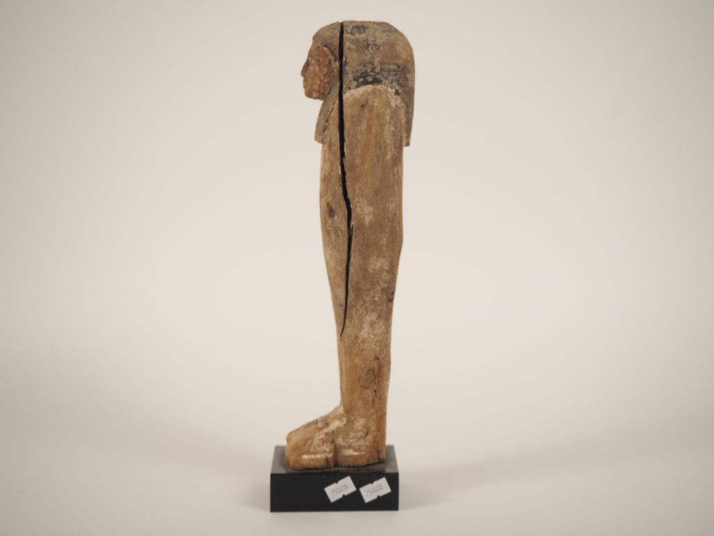 Egypte, Basse Epoque (664-332 av. J.-C). Statuette de Ptah-Sokar-Osiris en bois avec restes de polychromie. H. 34 cm. Usures et fissure sur le côté. Expert : Jean-Sylvain Caillou, EI.