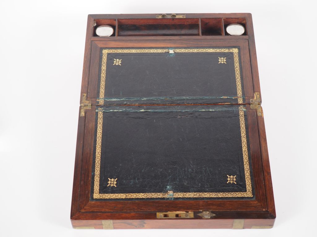 Encrier de voyage Victorien en bois gainé de laiton ouvrant à un abattant sur un écritoire en cuir noir, avec ses deux flacons. Dim. 15 x 35 x 23 cm.