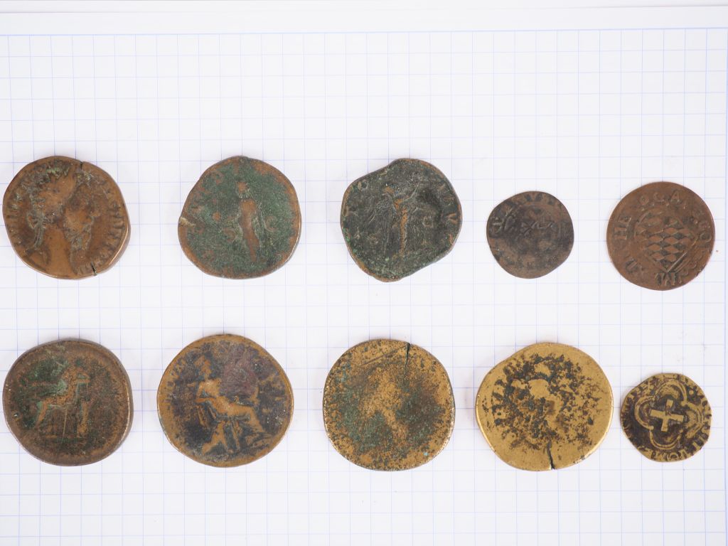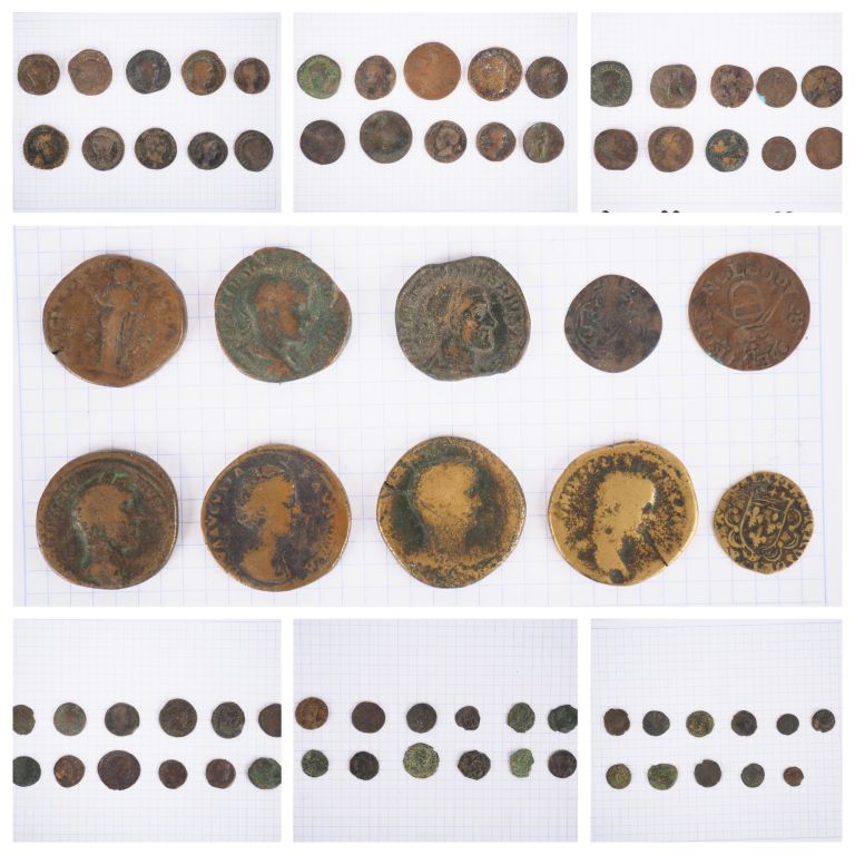 Ensemble de monnaies antiques en bronze. Diam. De 0,3 à 3 cm.
