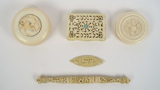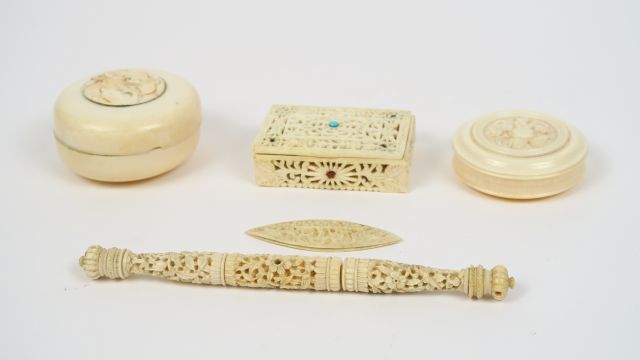 Etui à aiguilles en ivoire sculptée à décor de fleurs , 2 boites rondes en ivoire sculptée. Une navette et une boite en ivoire ajourée