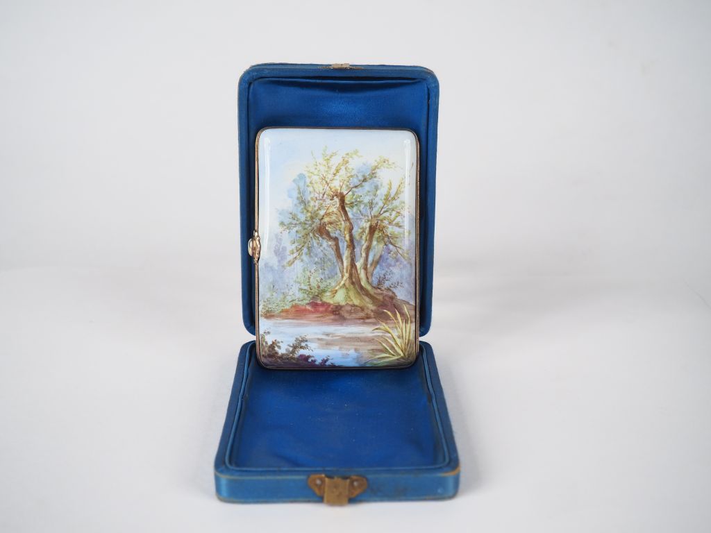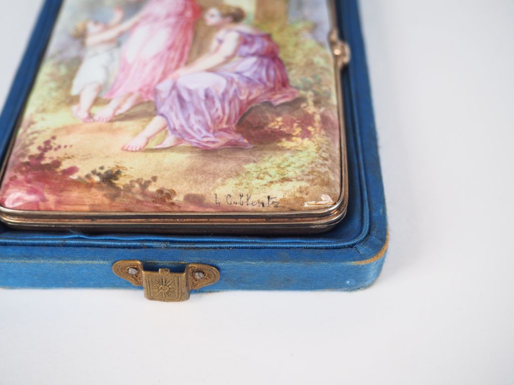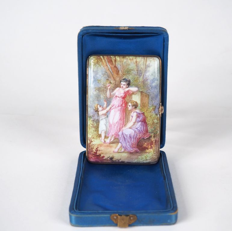Etui à cigarettes et carnet de bal en émail, à décor de femmes et d'enfant dans un paysage. Dans son coffret. Dim. 11 x 7,5 cm