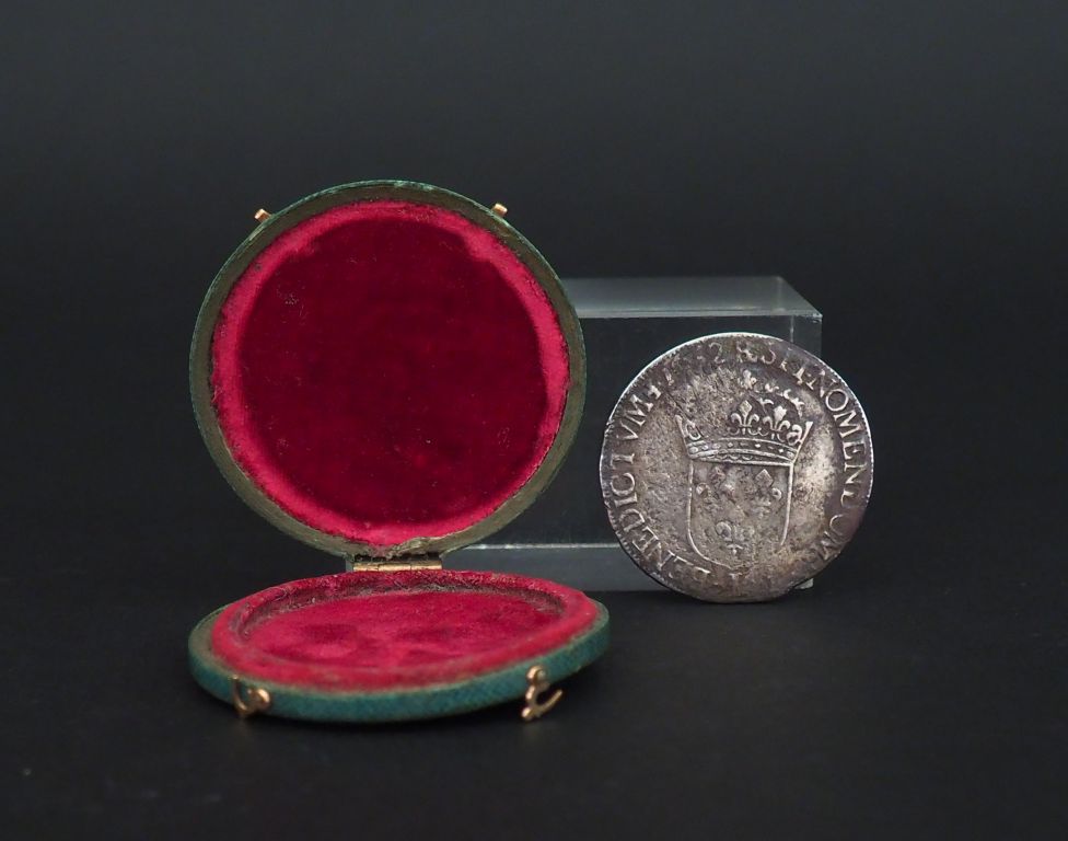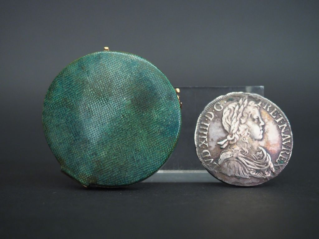 Etui fin XVIIIème début XIXème à sous en galuchat vert, intérieur en velours rouge, contenant un écu Louis XIV 1652 L Diam. 5,5 cm.