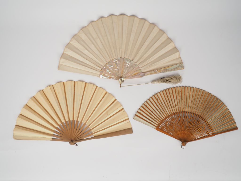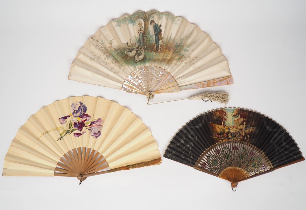 Eventail 1900 en nacre et soie à d'une composition d'après Sauronet, 16 brins. L. 26 cm. (Usures). On y joint deux différents éventails modernes. L. 23 et 24 cm.
