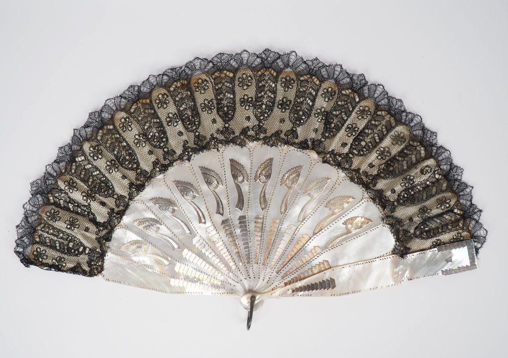 Eventail Art Déco en nacre soie et dentelle noir à décor de motifs géométriques, 14 brins. L. 30 cm. (Restauration)