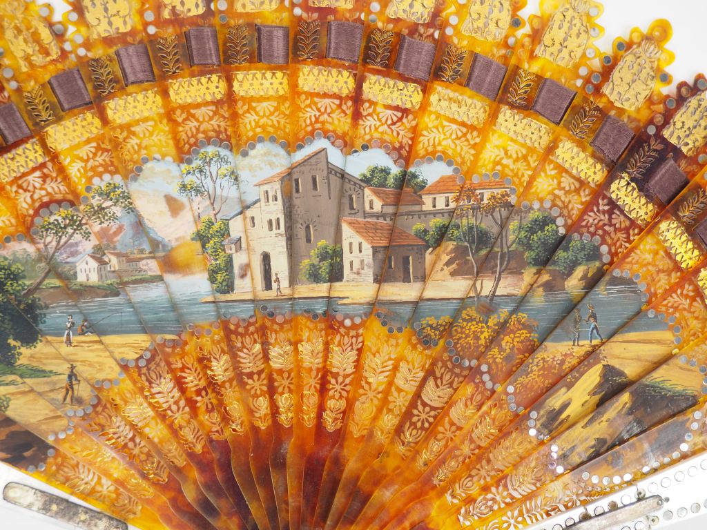 Eventail XIXème à décor de pêcheurs et d'un village au bord de l'eau, 21 brins. L. 16 cm. (Accidents et Restaurations).