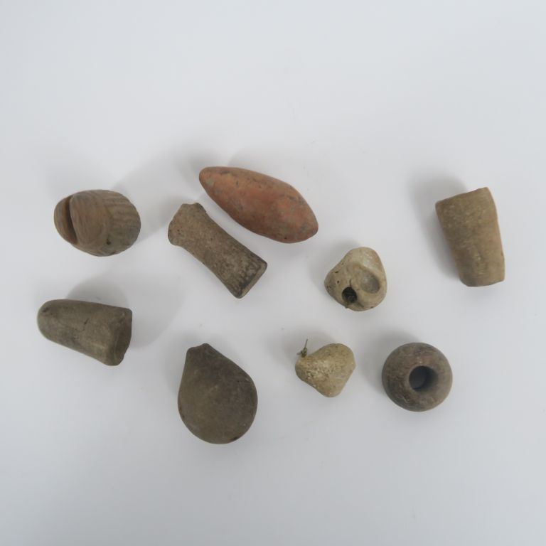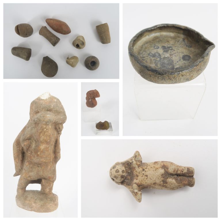 Figurine antique représentant un homme barbu portant une femme sur son dos (tête manquante). 17,5 x 8 x 3,5 cm. On joint un fragment de figurine et une pierre (8,5 x 5,5 et 5,5 x 5), une ancienne lampe à huile en métal (11 x 10 x 2 cm) une figurine en terre cuite (4,5 x 3 cm) et d’autres petits objets en terre cuite, etc. (5 x 2 à 2 x 2 cm).