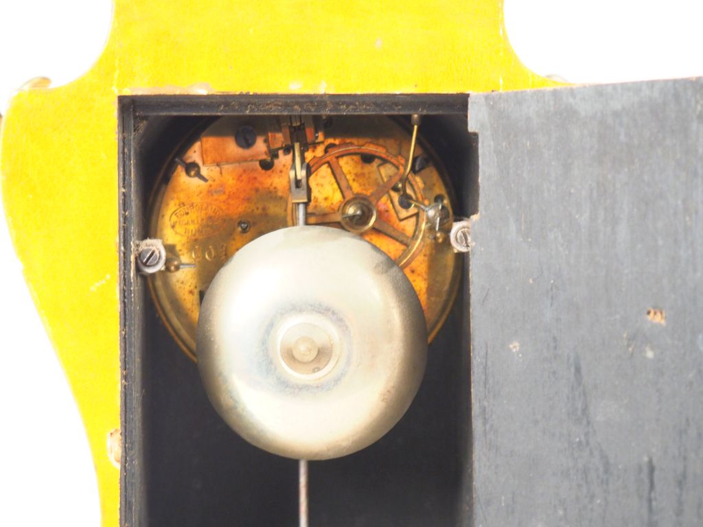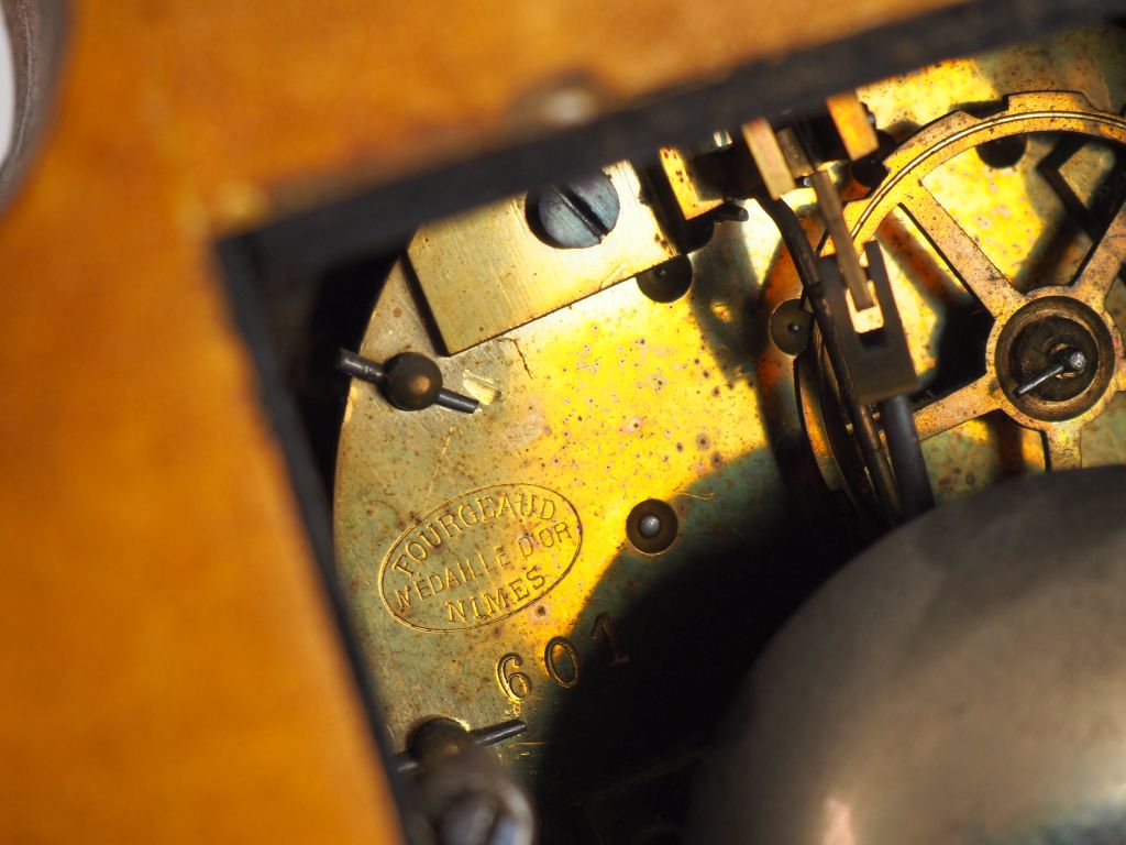 Garniture de cheminée de style Louis XV en Vernis Martin et métal doré comprenant une pendule, mouvement signé Fourgeaud. H. 37 cm et une paire de bougeoirs doubles (sauts de vernis).