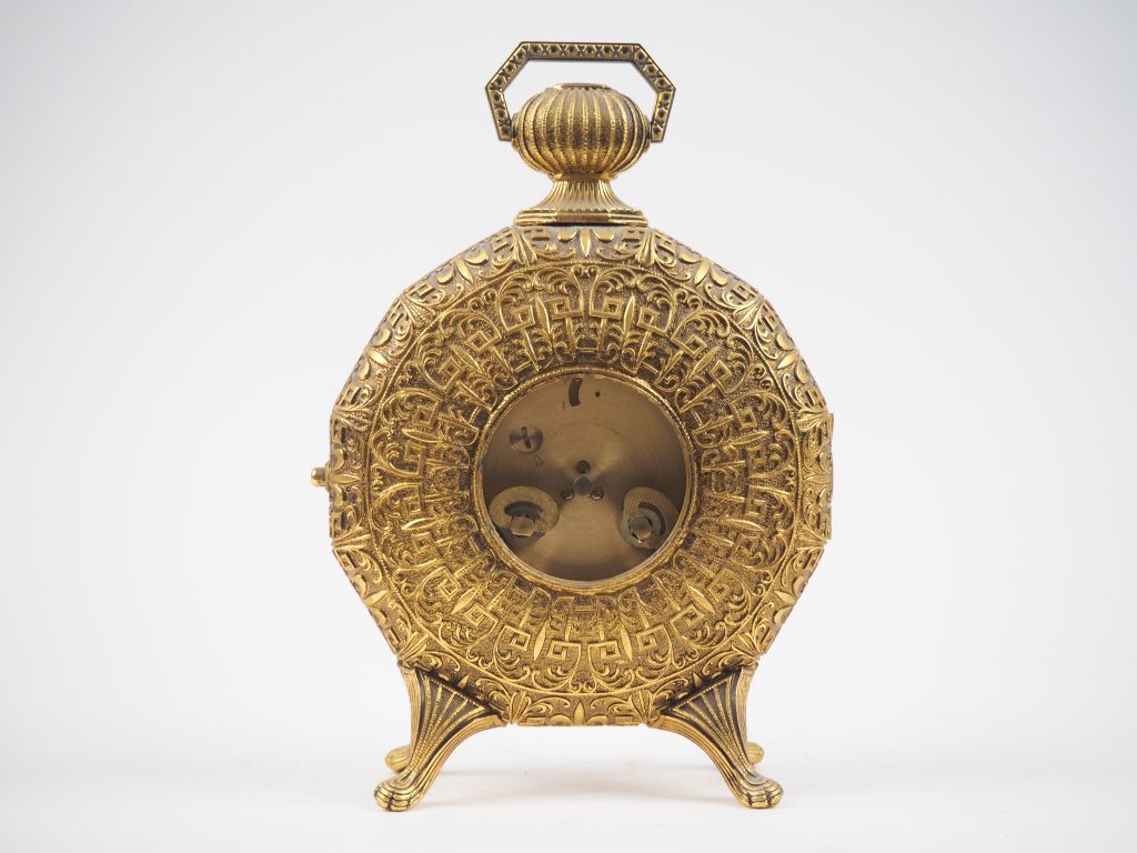 Grand réveil sur pied de style Renaissance en métal doré. Dim. 23 x 1...