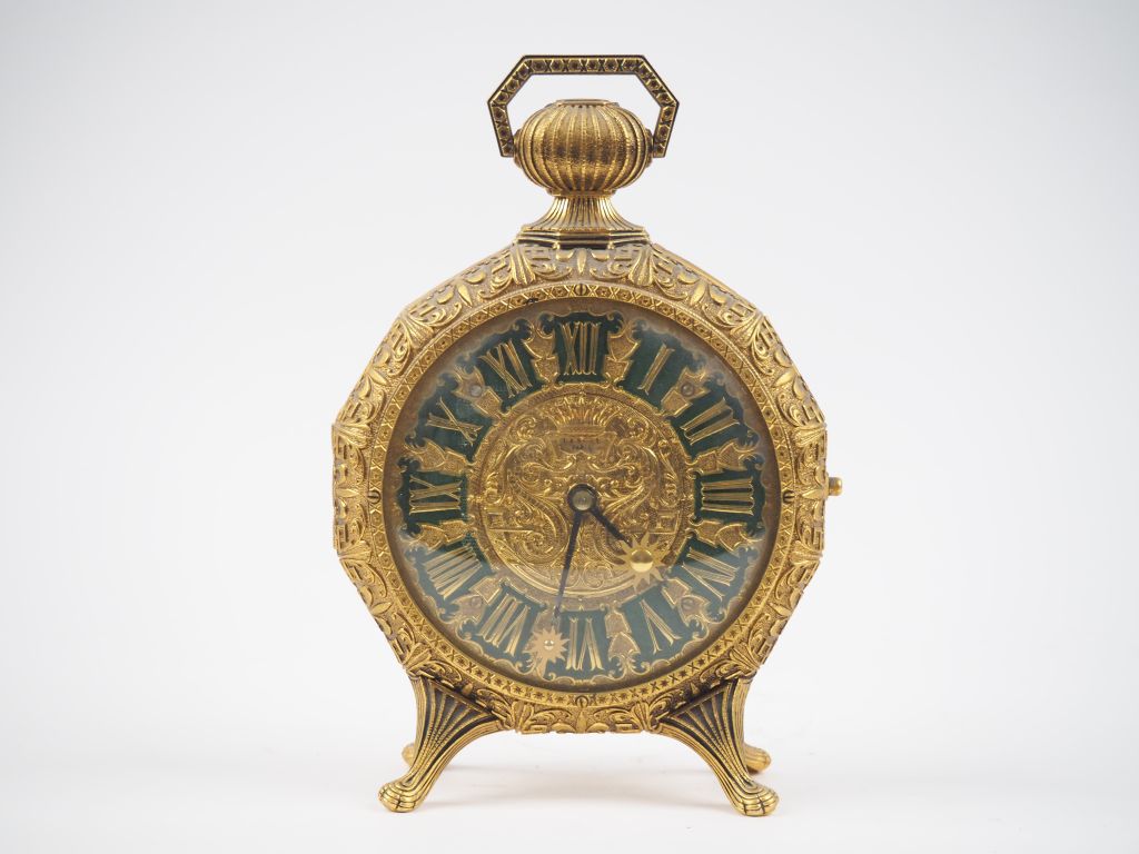 Grand réveil sur pied de style Renaissance en métal doré. Dim. 23 x 16 cm