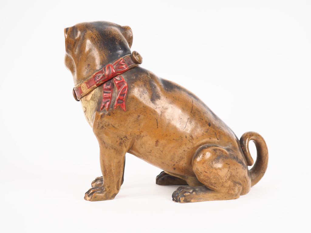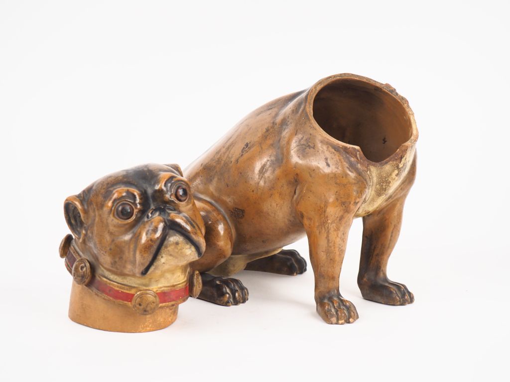 Grand sujet pot à tabac en terre cuite polychrome en forme de carlin. Dim. 24,5 x 26 cm (accidents et restaurations)