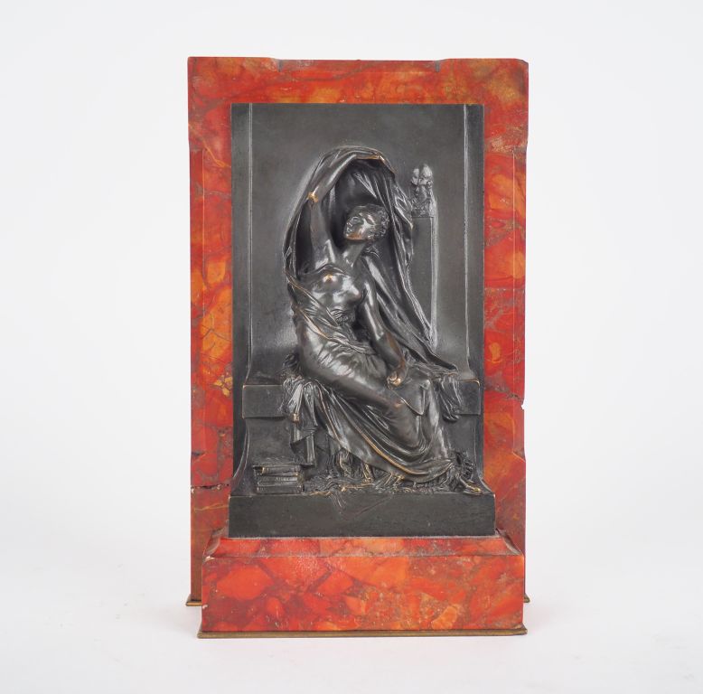 H. CHAPU. "La pensée". Plaque en bronze à patine brune sur un présentoir en marbre rouge (accidentée). Dim. 20,5 x 12,5 x 5 cm.