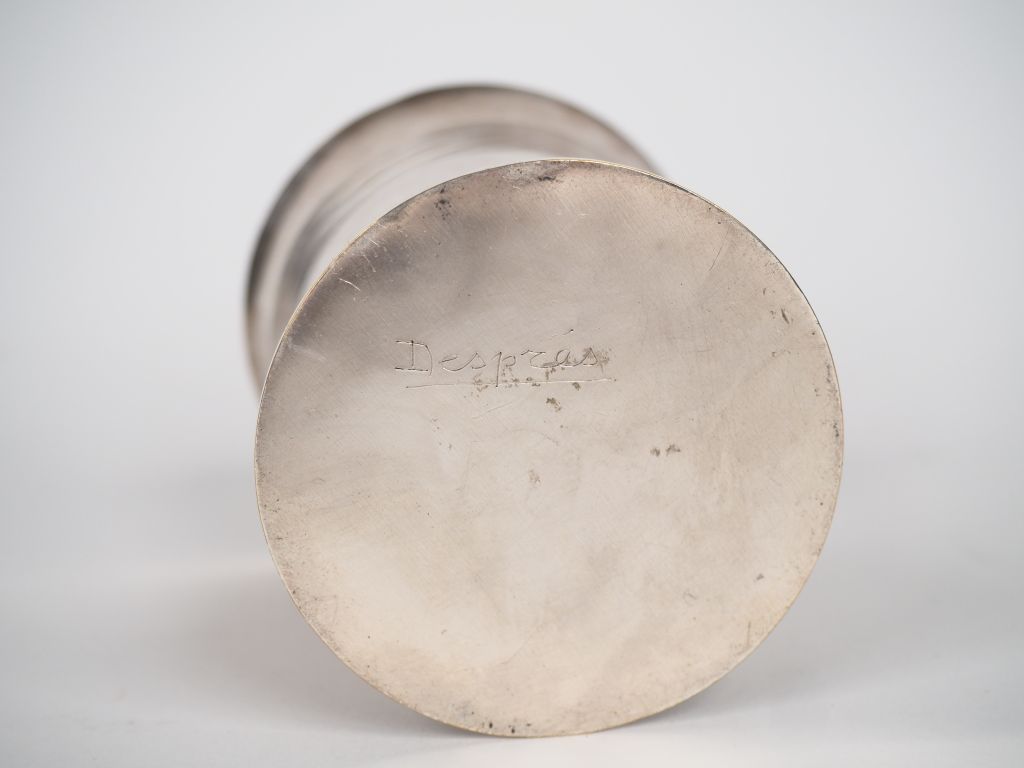Lot de Jean DESPRES. Timbale tulipe en métal argenté. Signée. Dim. 9 x 7,6 cm au prix de 80 à 120 € en vente aux enchères par l'hôtel des ventes Primardeco