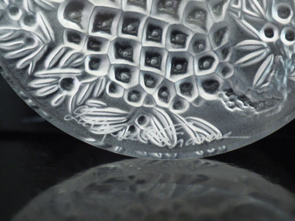 LALIQUE France, Médaillon à suspendre en verre moulé pressé, à décor de feuillage. Gravé sur la tranche "Noël 2001". Signé. Diam. 6,7 cm Dans sa boite