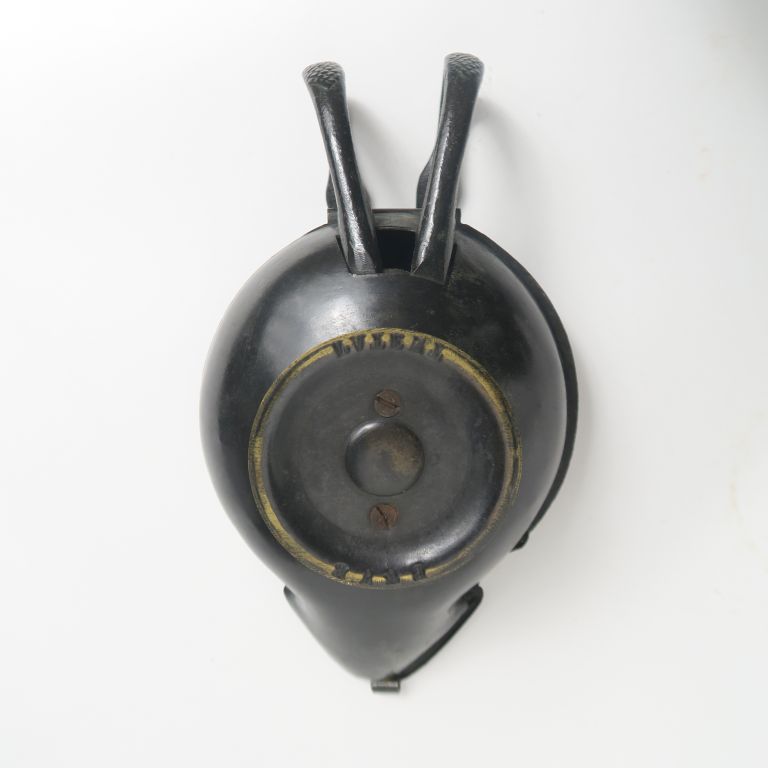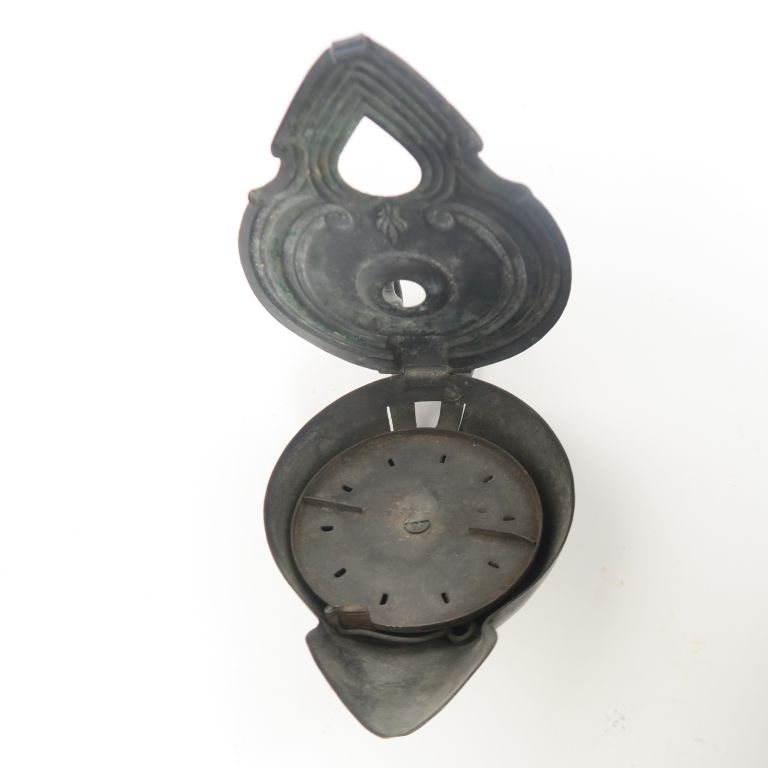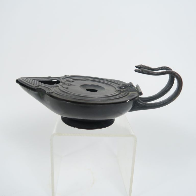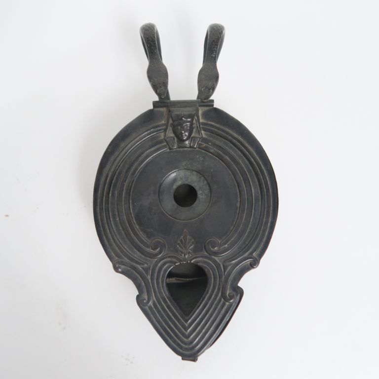 Lampe en bronze dans le style antique décorée d’un buste égyptien en relief et d’anses en forme de serpent. XIXème s. 18,5 x 10 x 4 cm.