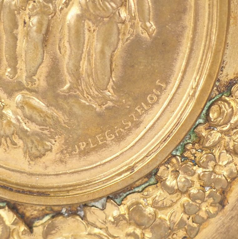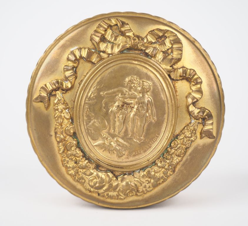 LEGASTELOIS. Boite couverte de style Louis XVI en laiton, à décor de deux amours dans une réserve entourée, de nœuds de rubans et d'une guirlande de fleurs. Signée. Dim. 5 x 9 cm.