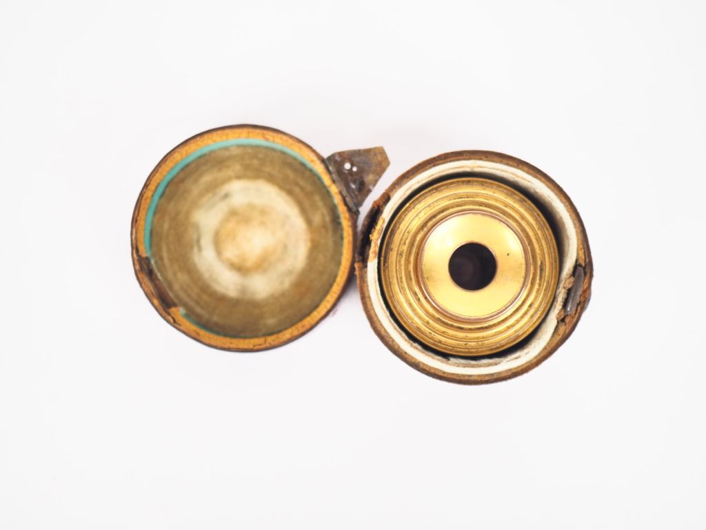 Longue-vue début XIXème en laiton gainé de cuir à décor d'angelots, dans son étui en cuir rouge. H. 9 cm. (Petites usures).