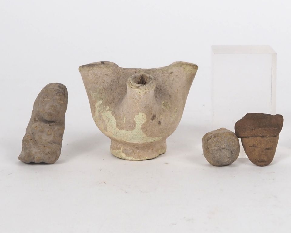 Lot comprenant un lampe islamique en terre cuite (8 x 6 cm) et trois fragments de figurines en terre cuite dont une tête du type de Téotihuacan. H. max. 5,5 cm Expert : Jean-Sylvain Caillou, EI.