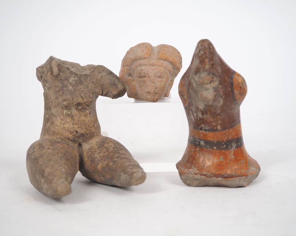 lot comprenant une tête et un corps de figurines mésoaméricaines. H. max. 6 cm. On joint un pied de céramique peinte précolombienne (H. 8 cm). Expert : Jean-Sylvain Caillou, EI.