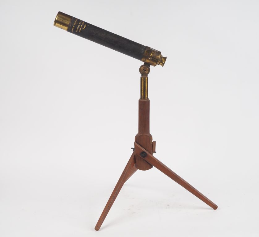 Lunette astronomique en cuir et laiton, sur un piétement tripode, marquée "Lunette extraordinaire du journal du Ciel, cours de Rohan Paris" H. pied et base de la lunette : 59 cm longueur de la lunette : 36 cm (verre de lunette fendu)