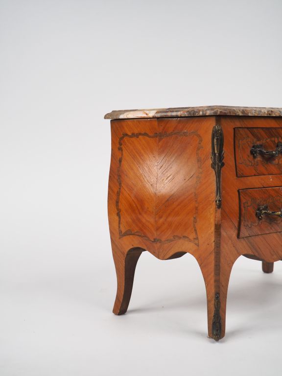 Meuble de maitrise figurant une commode sauteuse de style Louis XV en marqueterie ouvrant à 2 tiroirs, dessus marbre. Dim. 23 x 30 x 15,5 cm.