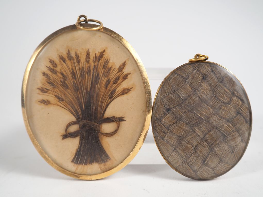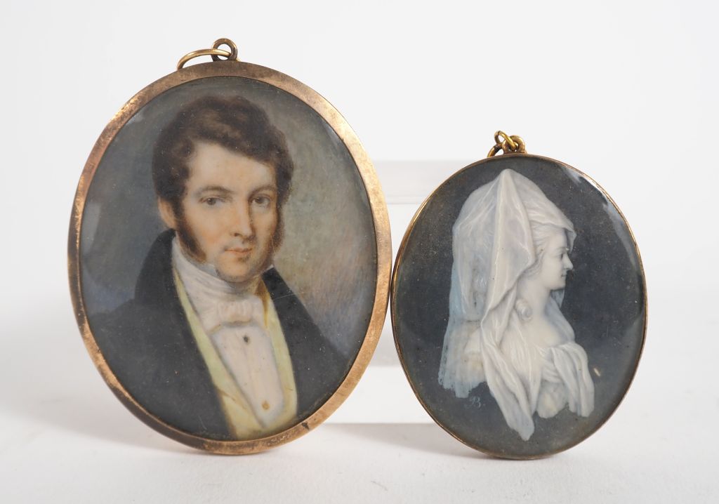 Miniature Directoire, "portrait d'homme au jabot", ornée au revers d'une gerbe de blé en cheveux. Dim. 6,5 x 5 cm. On y joint une miniature XIXème "portrait de femme", ornée au revers d'une tresse en cheveux. Signée. Dim. 5 x 4 cm.