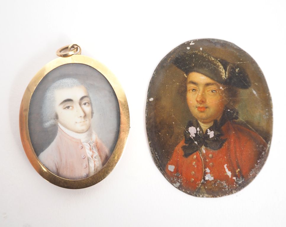 Miniature fin XVIIIème, "portrait d'homme à l'habit rouge" Dim. 4,5 x 3,8 cm. On y joint une miniature sur zinc, "portrait de jeune homme". Dim. 6 x 4,5 cm. (Mauvais état).