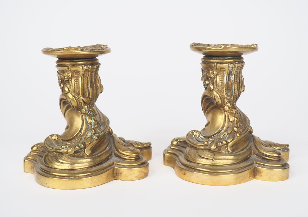 Paire de bougeoirs de toilette XIXème de style Louis XV en bronze à décor feuillagé. H. 9.5 cm.
