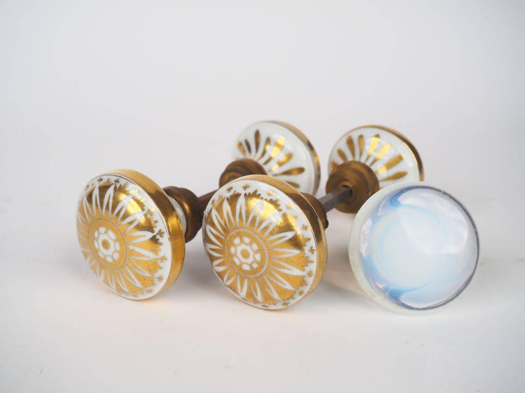 Paire de poignées de porte de style Empire en porcelaine blanche et dorée , On y joint une poignée de porte en verre opalescent.