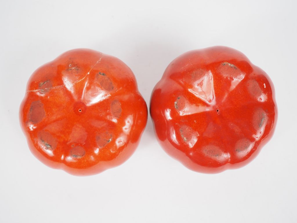 Paire de presse-papiers en porcelaine figurant deux tomates. Dim. 7 x 10 cm. (Accident sur l'un)