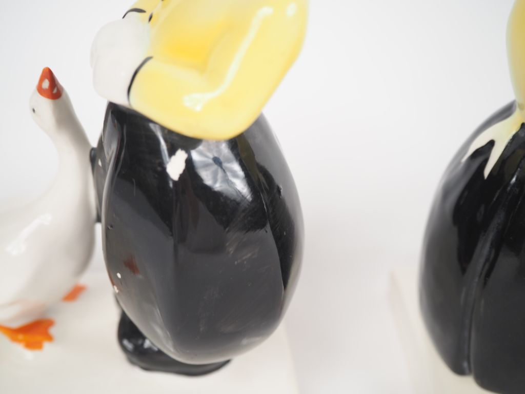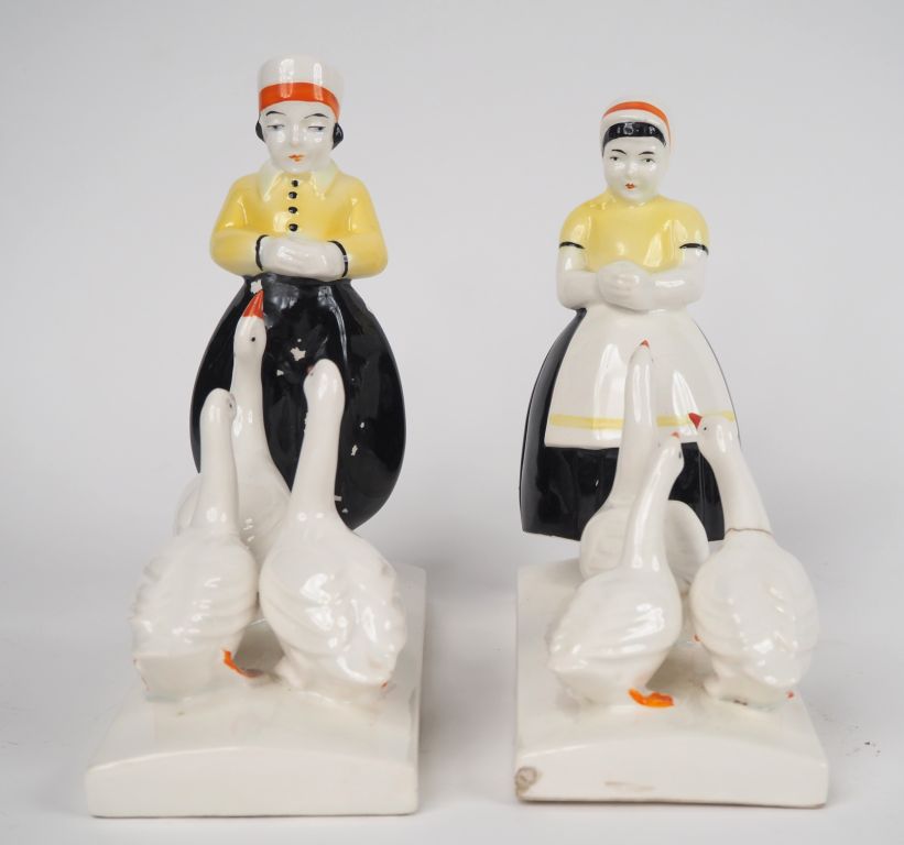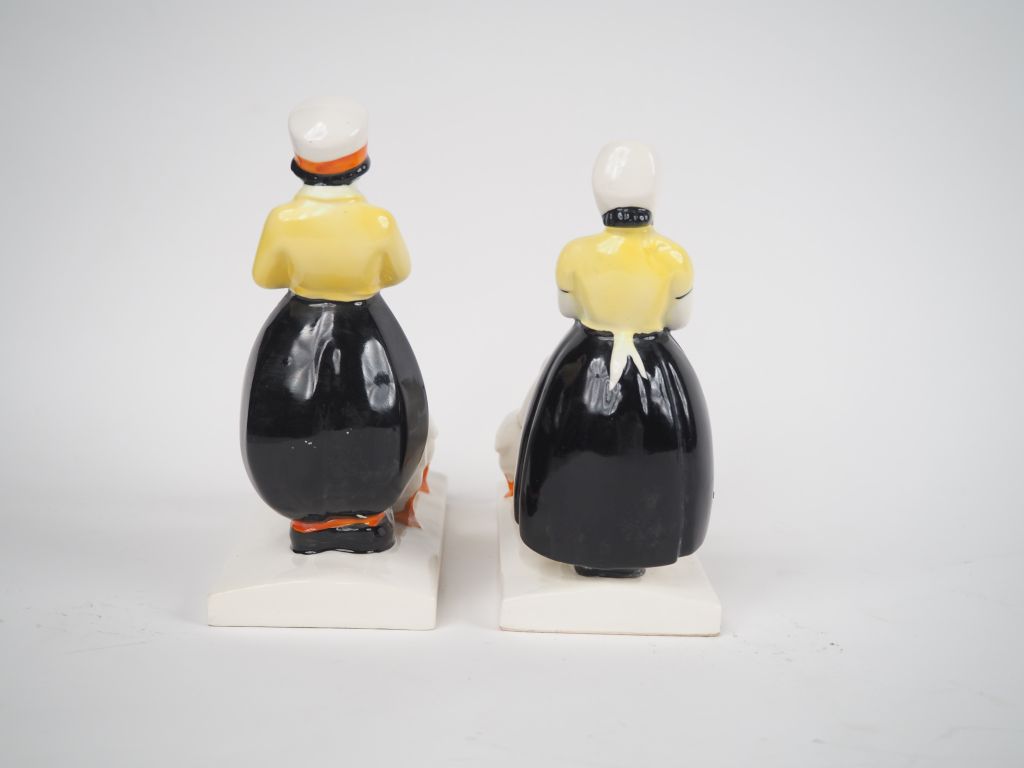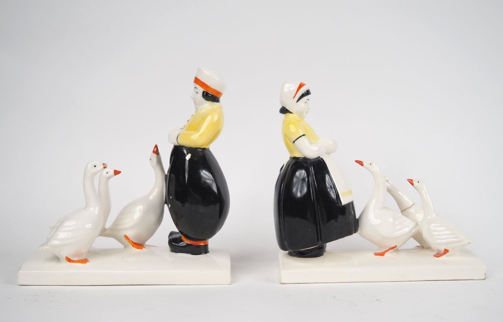 Paire de serre livres Art Déco en porcelaine polychrome en forme de jeunes gardiens d'oies hollandais. (petits accidents) Dim. 17,5 x 16,5 x 7,5 cm
