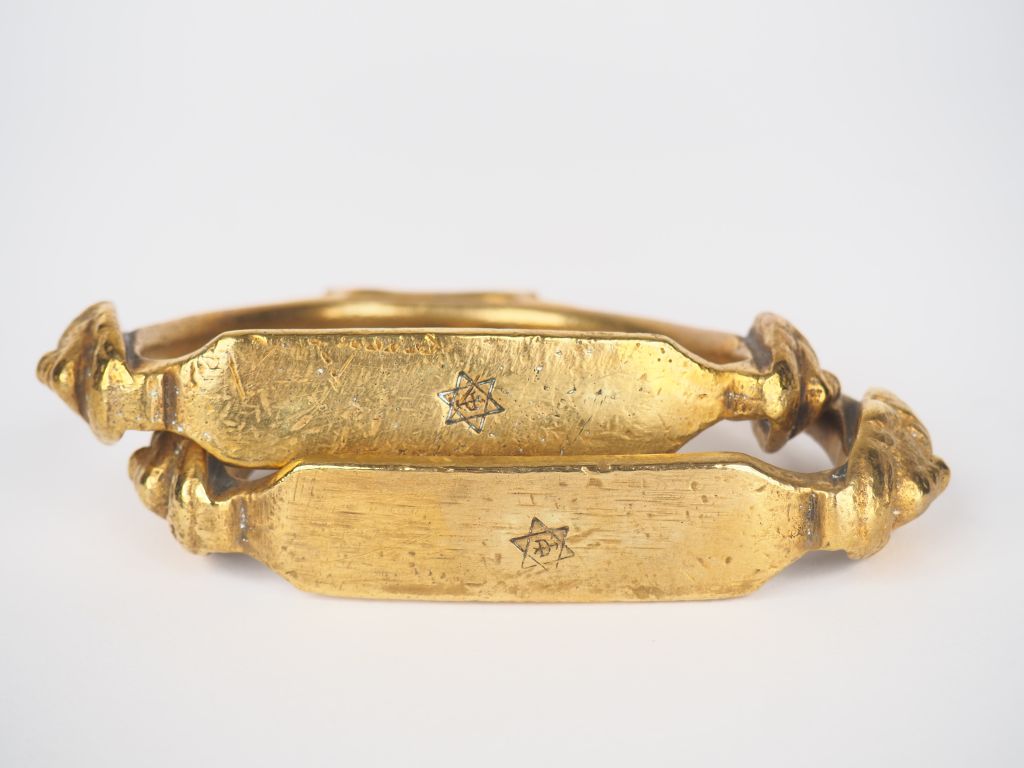 Paire d'étriers XIXèm en bronze doré à décor de visages de guerriers, signés. Dim. 9 x 12 cm. On y joint un étrier XVIIIème en bronze à décor feuillagé. Dim. 10 x 10,5 cm.