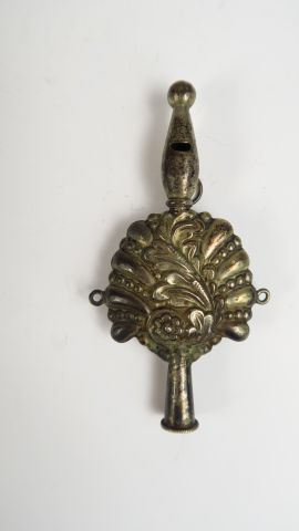 Partie supérieure de hochet siffleur XIXe en argent repoussé, à décor de feuillage, de fleurs, de godrons et de rangs de perles. Longueur : 7,5 cm. Poids : 6 g (manque les grelots)