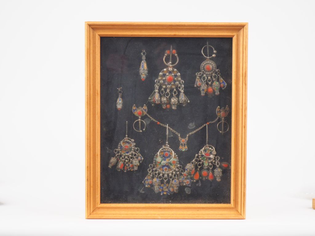 Parure Afrique du nord en métal argenté ou argent bas-titre, émail et cabochons de pierres dures, rassemblées dans un encadrement. Dim. (à vue) : 28 x 22 cm.