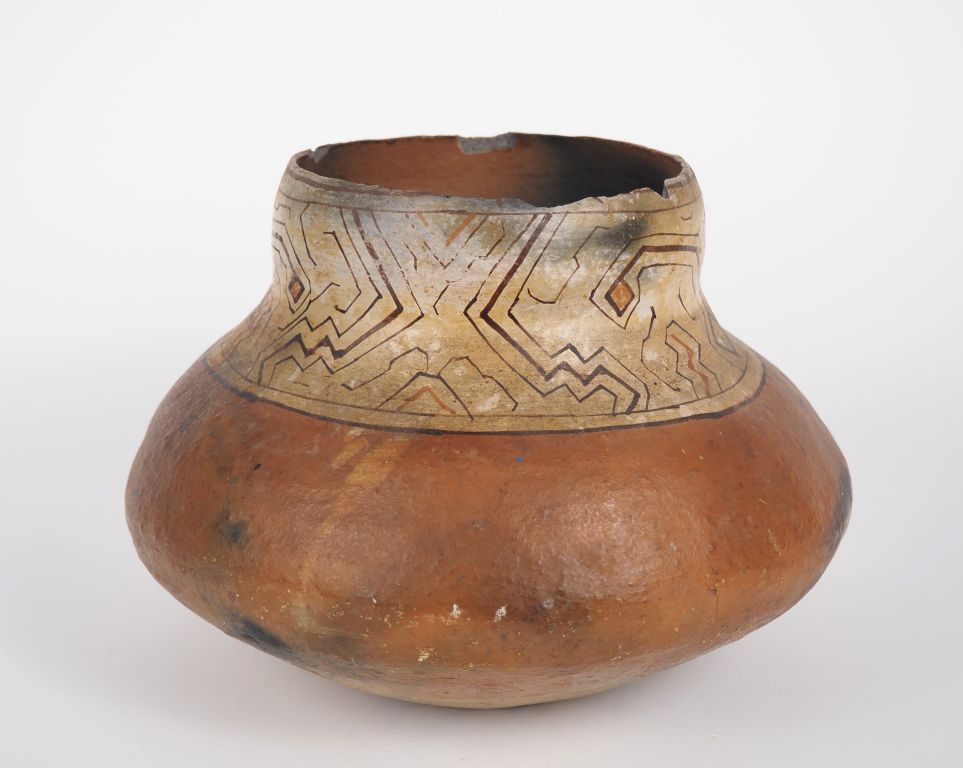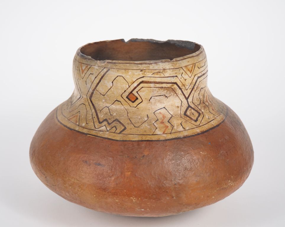 PEROU (Amazonie), culture Shipibo. Vase au col orné de lignes rouges et noires sur fond crème. H. 17 cm. (accidents). Expert : Jean-Sylvain Caillou, EI