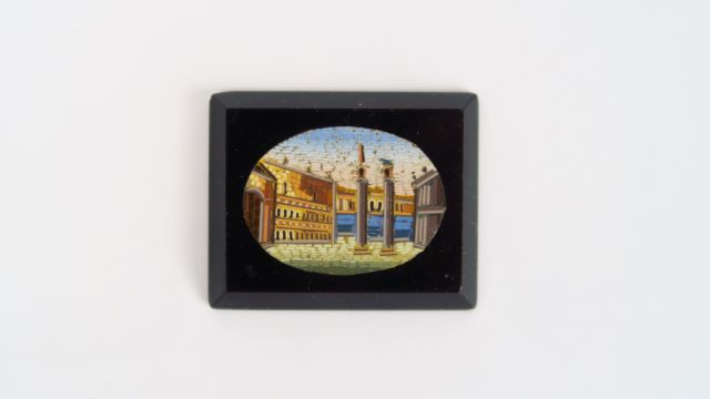 Plaque en micro mosaique à décor d'architecture. 3 x 3,8 cm