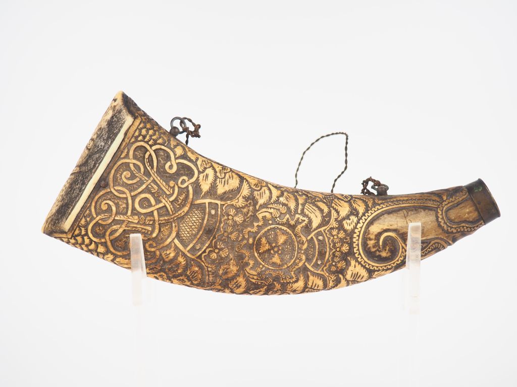 Poire à poudre XIXème de style Renaissance en os ou corne sculpté à décor de tête d'éléphant, de sanglier, d'animaux et de végétaux. Dim. 28 x 10 cm.