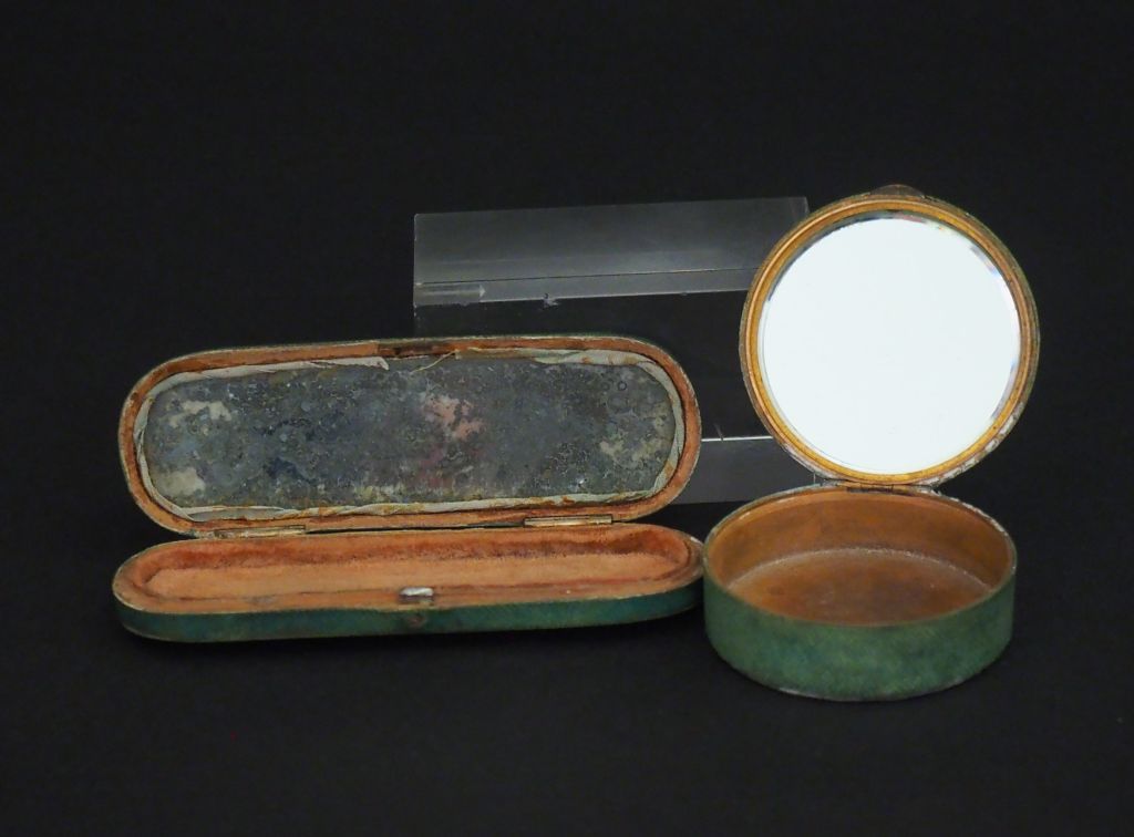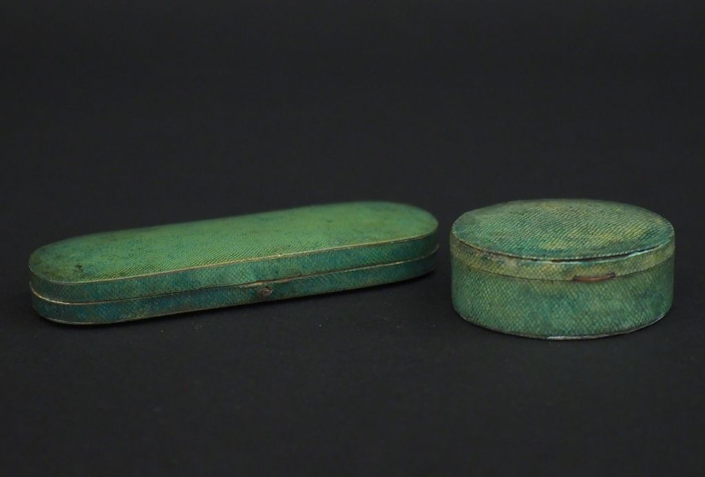 Poudrier début XIXème en galuchat vert, intérieur en velours et fond de glace. Dim. 9,5 x 3 cm. On y joint un poudrier début XIXème en galuchat vert, interieur en velours et fond de glace. Dim. 1,8 x 4,5 cm.