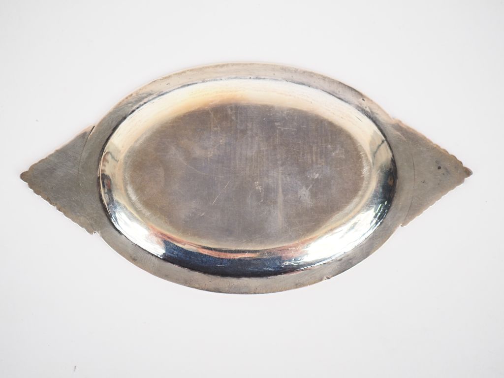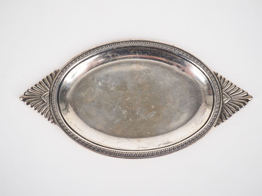 Présentoir à cartes de visite de style Louis XVI en argent, à décor de frise de rais de cœur. Anses en forme de palmettes. Dim. 8,5 x 16 cm Poids. 82 g