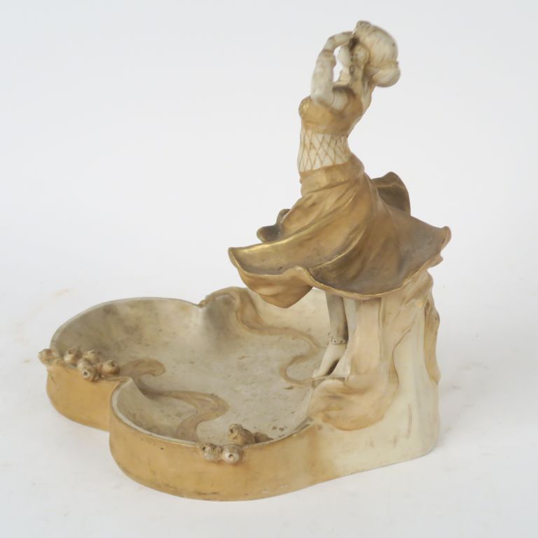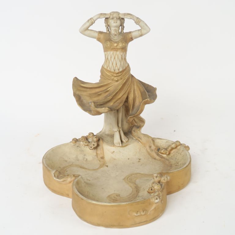 ROYAL DUX. Grand vide-poche Art Nouveau en biscuit blanc et doré à décor de danseuse. Signé. H. 29 x 26,5 x 29 cm.