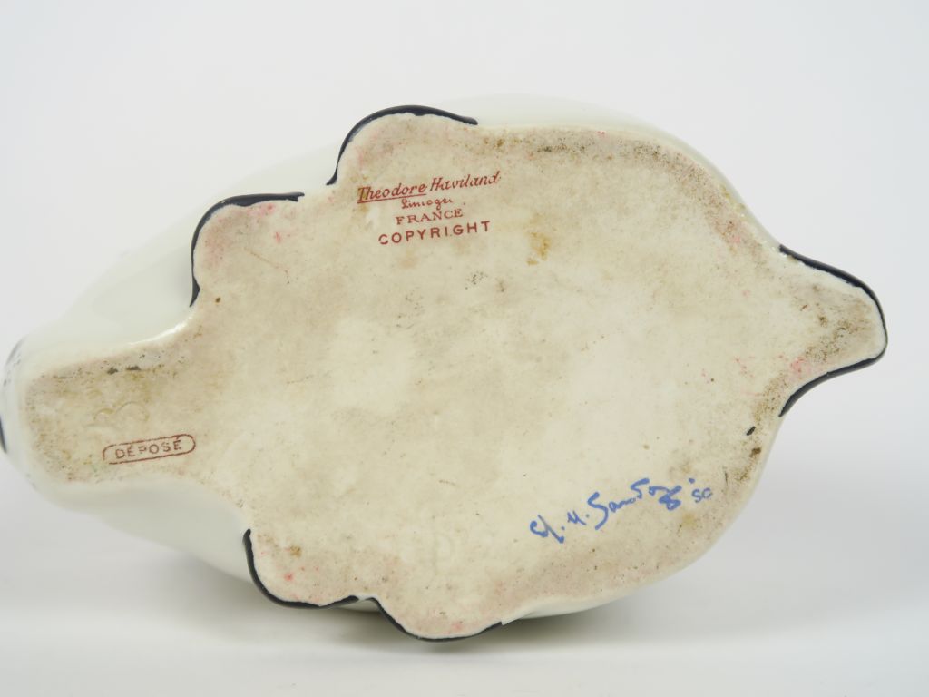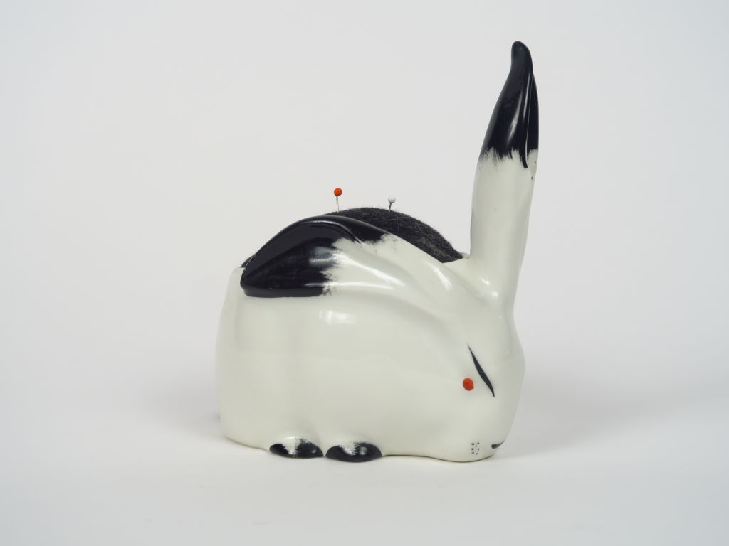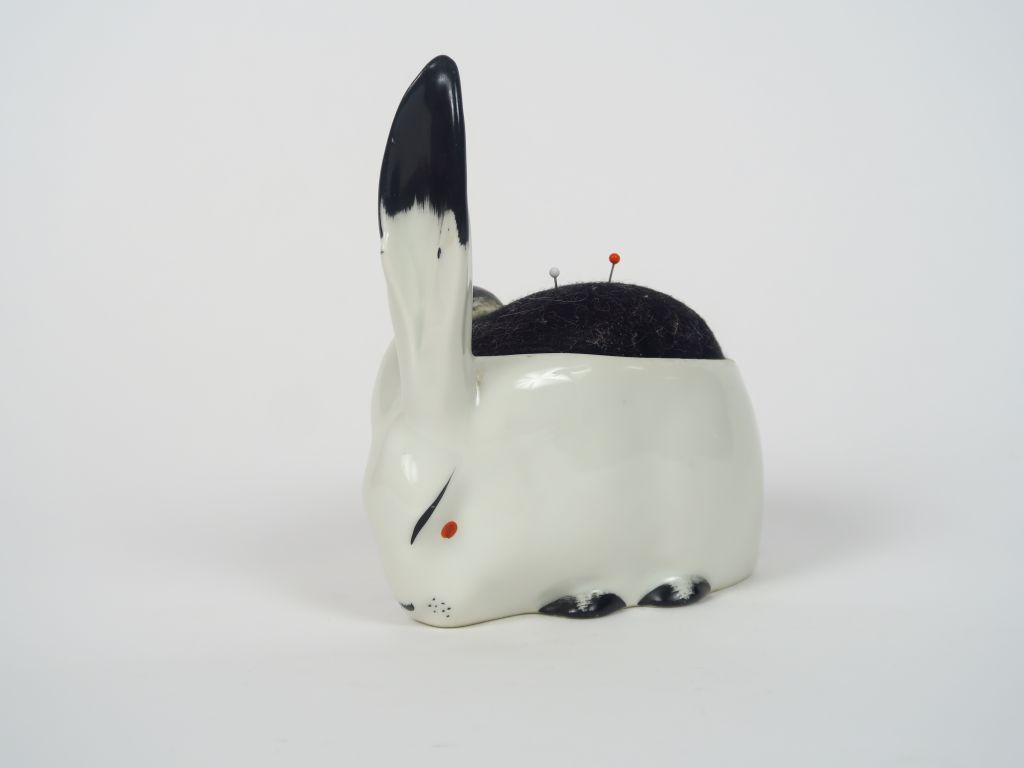 SANDOZ. Porte aiguille en porcelaine d'Haviland en forme de lapin. Signé. 15 x 13,5 x 8 cm