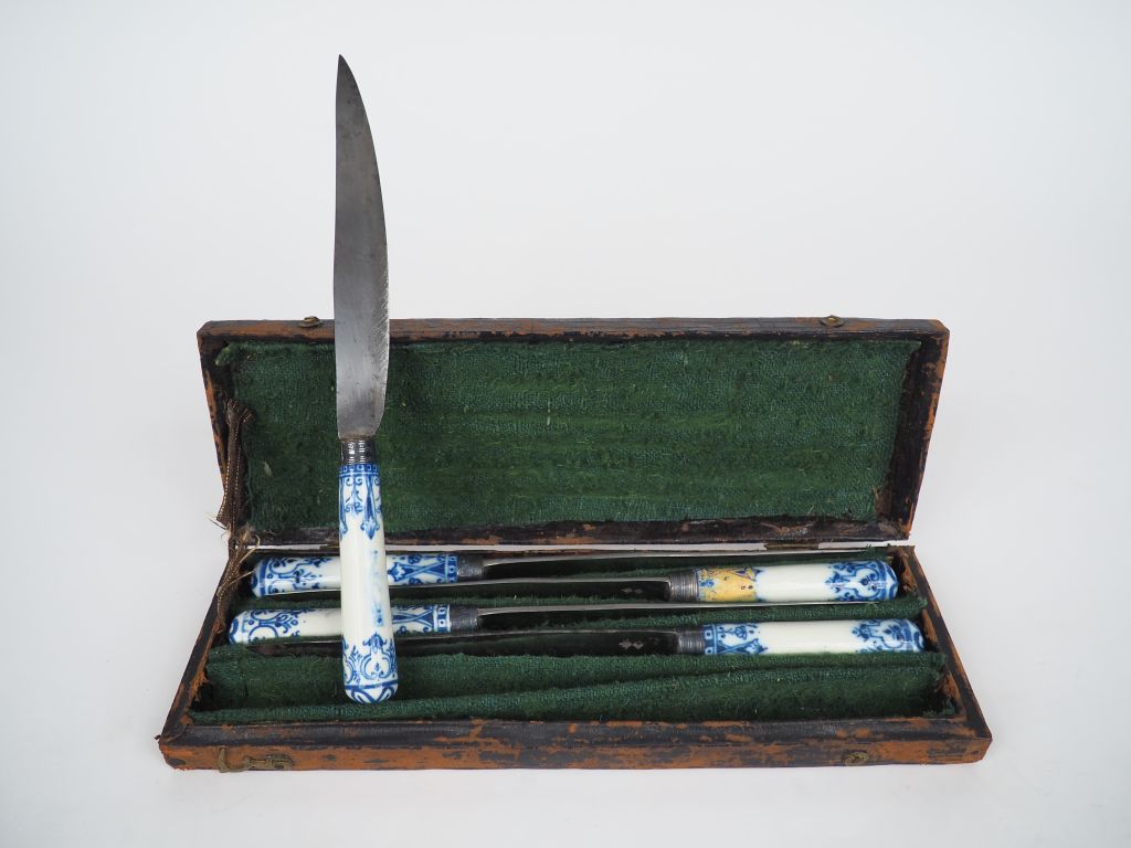 Suite de 5 couteaux XVIIIème dans leur coffret, manches en porcelaine à décor en bleu et blanc de lambrequins. Poinçonnés. L 26 cm. (Fels sur l'un, restauration sur un autre).