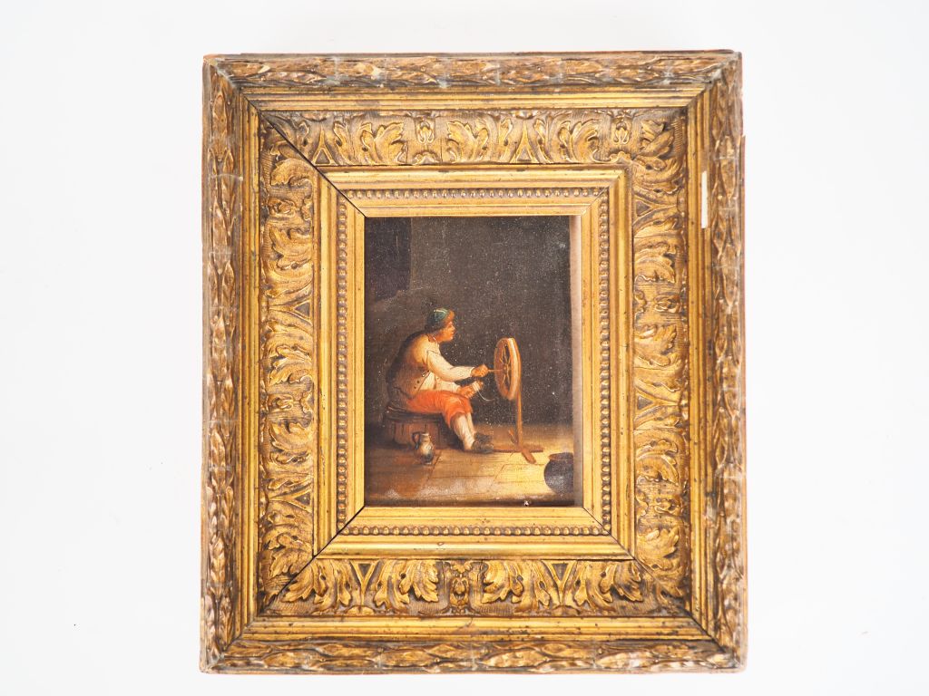 Tableautin XIXème. "Jeune homme au rouet". Huile sur panneau, dans un cadre en bois et stuc doré. Dim. 12,5 x 9,5 cm.